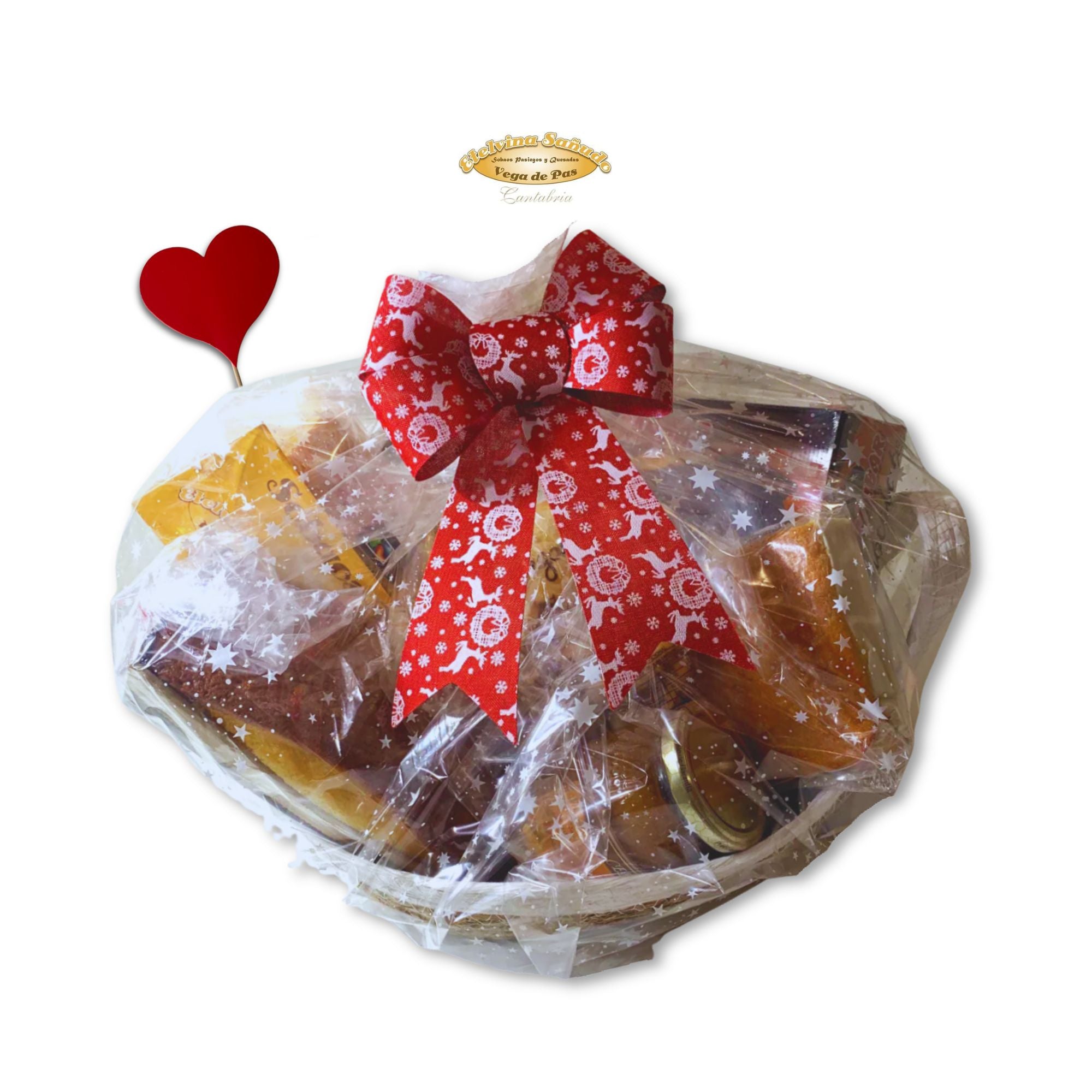 Incluye una selección amplia de sobaos, quesada, pastas, magdalenas y productos gourmet, elaborados de forma artesanal y presentados en una cesta cuidada al detalle, lista para regalar y enviar a domicilio.
